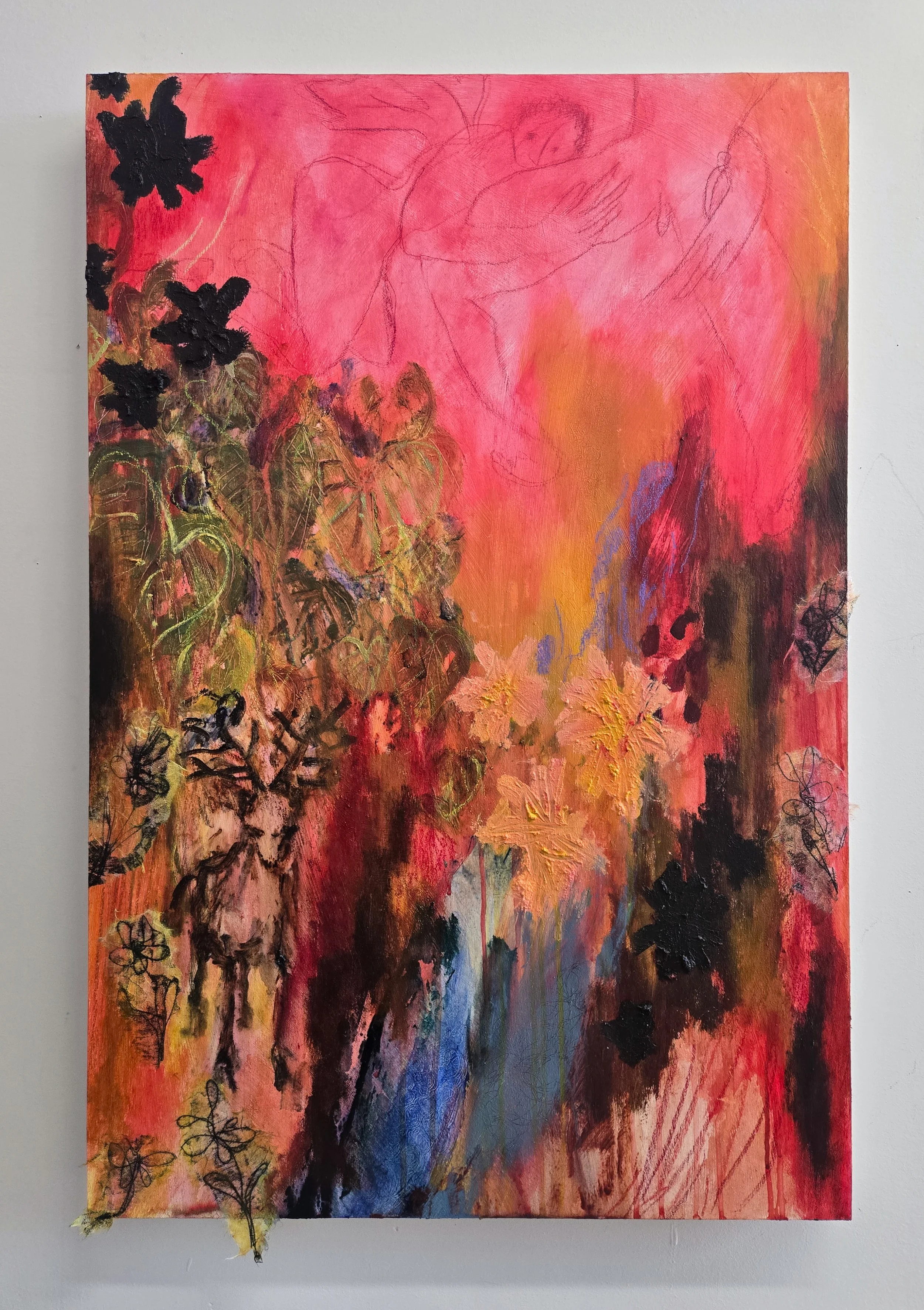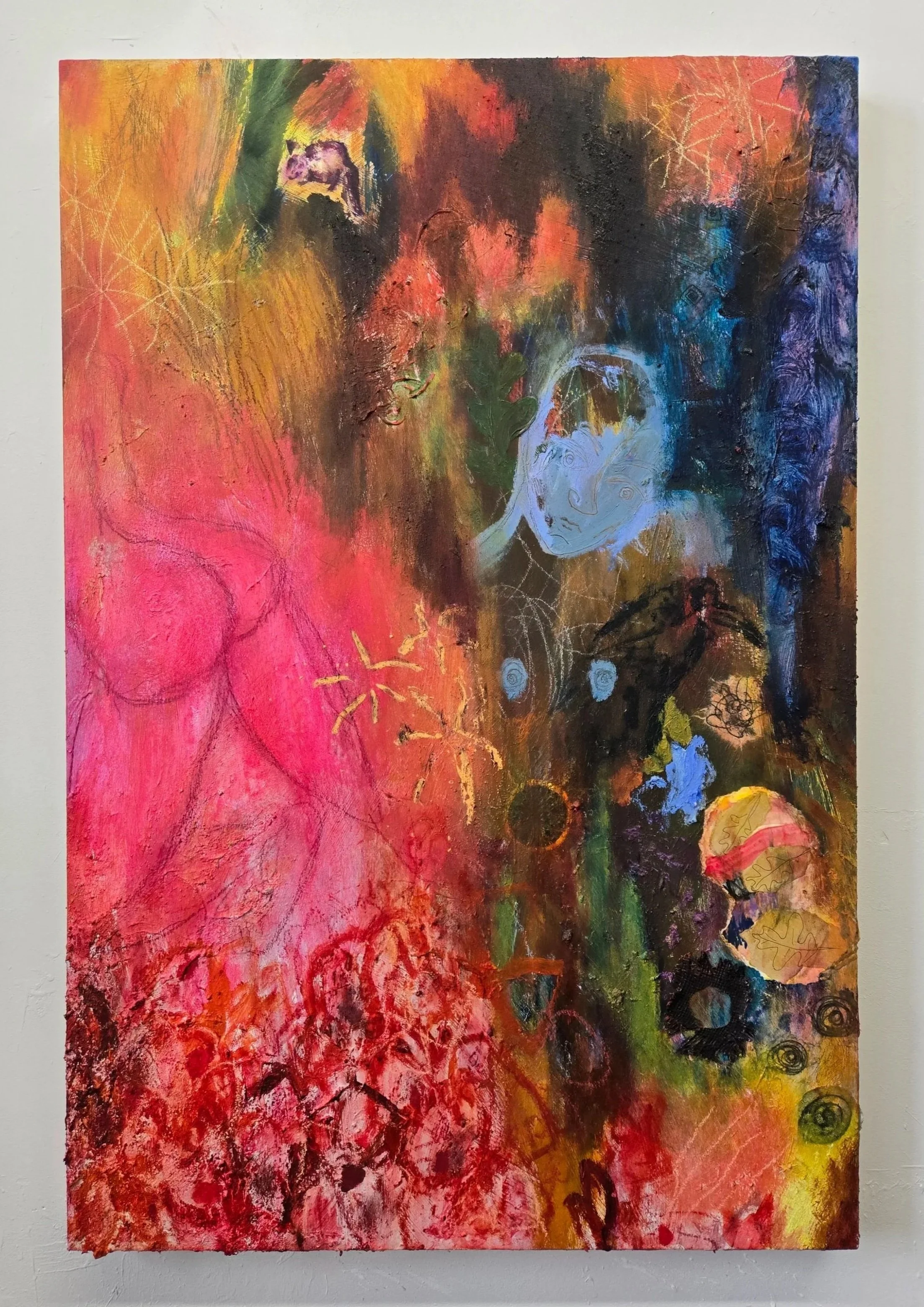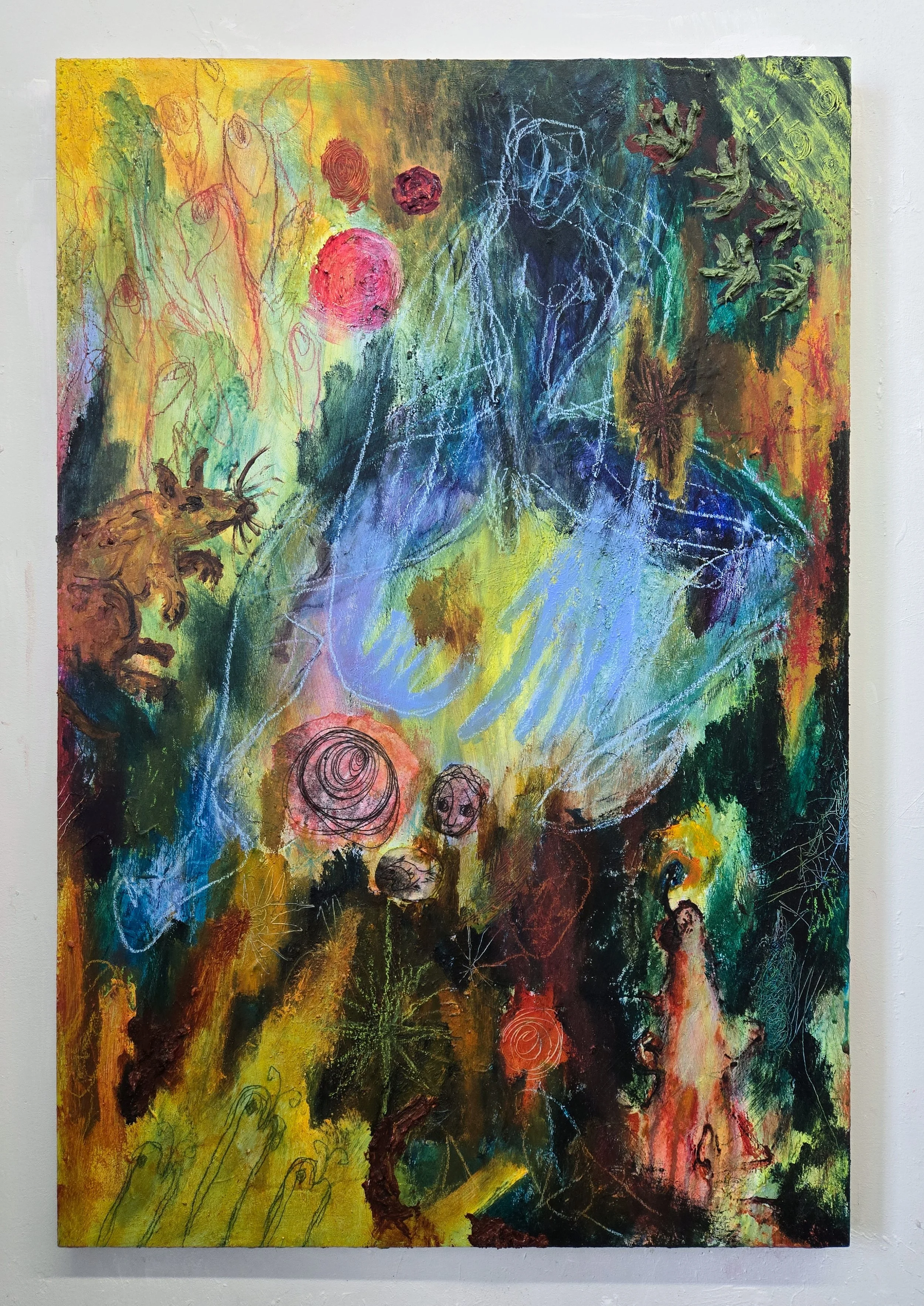 The Spell of Dusk, Colored Pencil, Crayon, Flashe, Pen, Paper, and Acrylic on Panel, 36x24