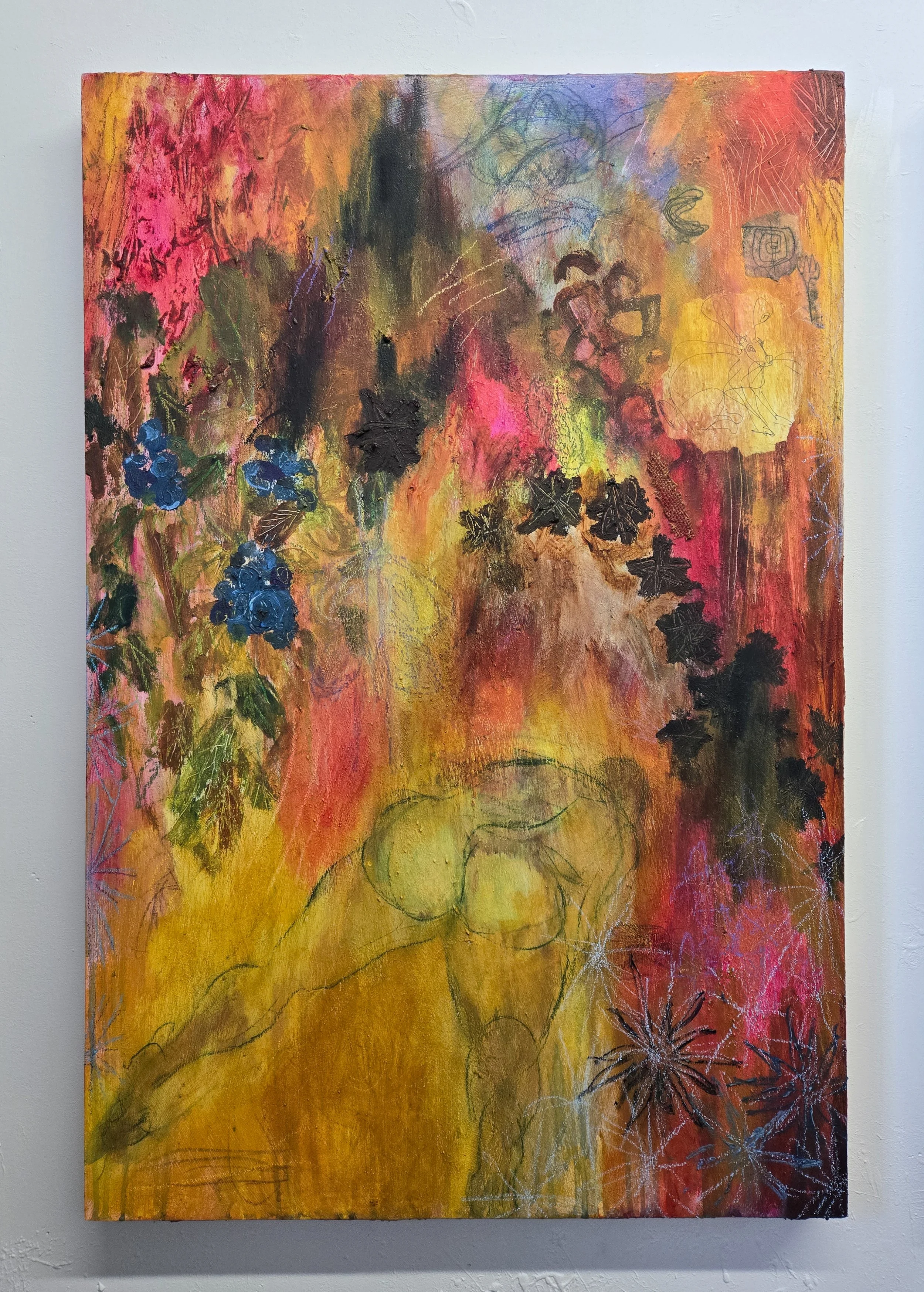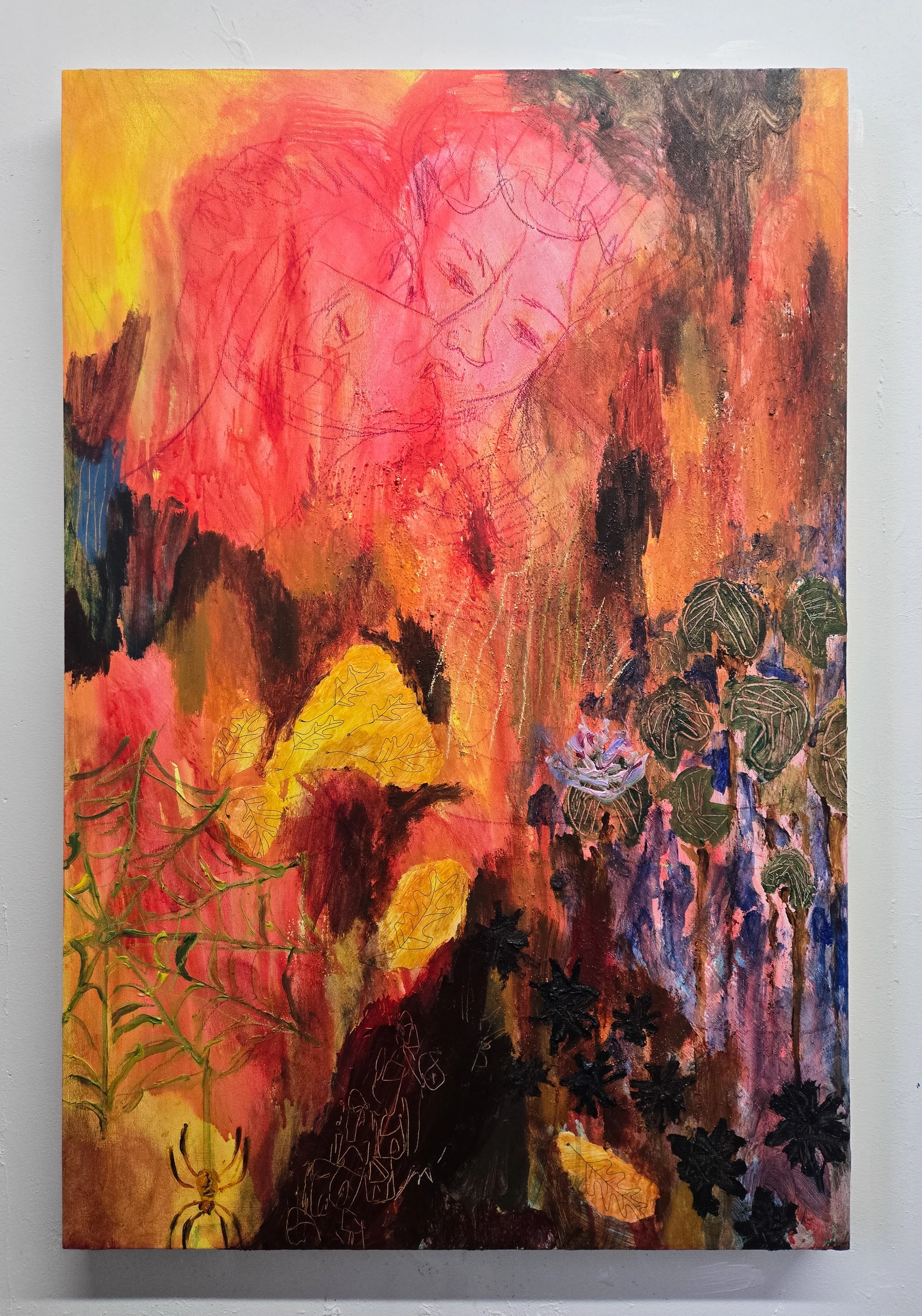 Late Summer, Colored Pencil, Crayon, Flashe, Pen, Paper, and Acrylic on Panel, 36x24
