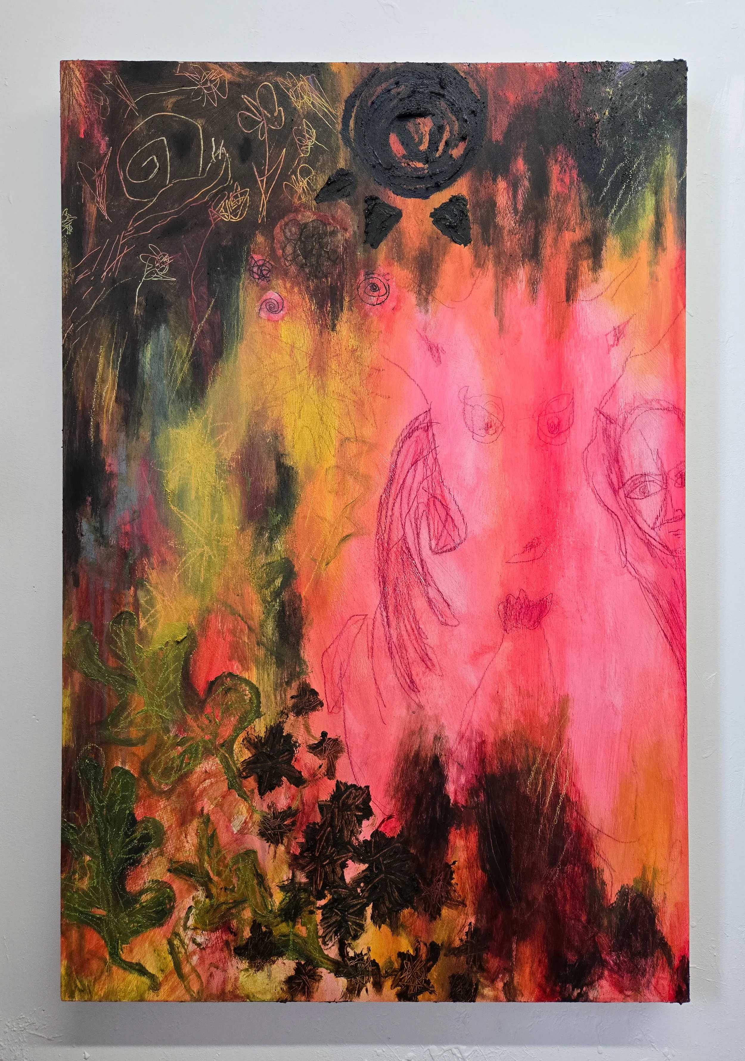 Dream Trap, Colored Pencil, Crayon, Flashe, Ink, Paper, and Acrylic on Panel, 36x24